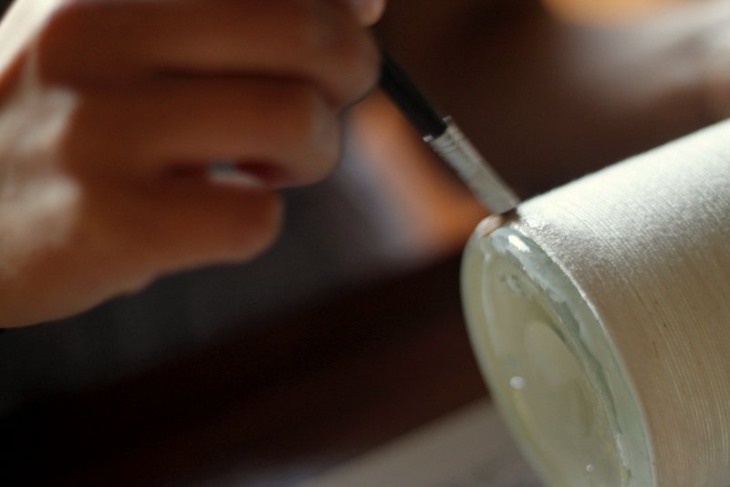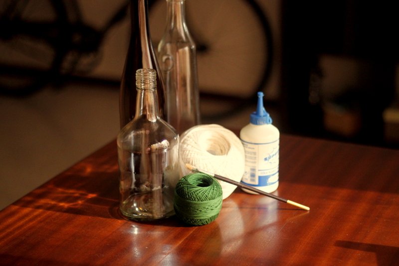 Primeiro lave e limpe bem as garrafas e deixe-as secar bem. Depois misture a cola branca com um pouco de água para a cola não ficar tão espessa.