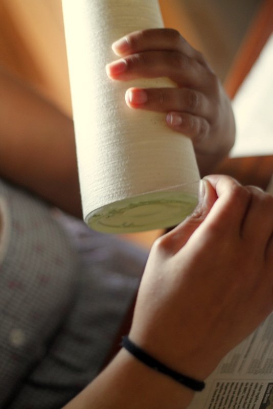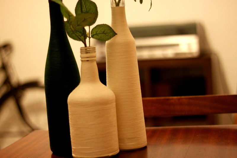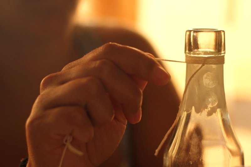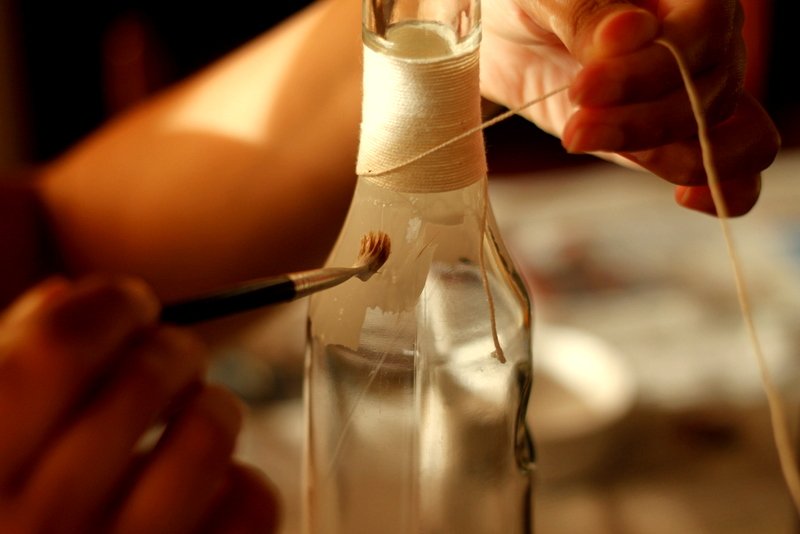 Agora é só colocar cola na garrafa e proceder conforme as fotografias a baixo. Quando estiver a acabar coloque um pouco de cola por cima da linha para ficar bem fixa. Agora é só deixar secar.